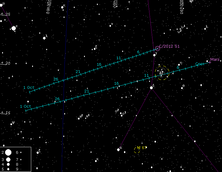 ----------------------------------------------------------------- Комета ISON (C/2012 S1) в сентябре: ----------------------------------------------------------------- Сентябрь 1 08h41m51.10s +22 07' 36.5" 2.1778 2.9710 11.4 31.7 Cnc 6 08h49m31.40s +21 32' 36.5" 2.0948 2.8443 11.2 34.6 Cnc 11 08h57m32.48s +20 54' 30.9" 2.0101 2.7132 10.9 37.5 Cnc 16 09h05m57.76s +20 12' 47.5" 1.9237 2.5780 10.6 40.2 Cnc 21 09h14m51.93s +19 26' 43.5" 1.8352 2.4391 10.3 42.9 Cnc 26 09h24m21.21s +18 35' 23.9" 1.7446 2.2966 9.9 45.4 Leo 1окт 09h34m33.55s +17 37' 36.1" 1.6516 2.1512 9.5 47.6 Leo ========================================== С.Гурьянов ==== |