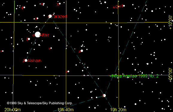 Позавчера вечером (1 декабря 1999г.) португальский любитель астрономии Альфредо Перейра, наблюдая небо с 14-кратным бинокуляром, обнаружил Новую звезду 6 величины в созвездии Орла, всего в двух градусах к северо-западу от Дельты Орла. Это уже вторая Новая, вспыхнувшая в этом созвездии в текущем году. Про первую я рассказывал ранее (и приводил свой снимок). Но Новая Перейры - гораздо ярче и может быть найдена с любым, даже театральным биноклем. Вчерашние наблюдения показали, что ее блеск даже чуть подрос! Так что, вперед - наблюдатели! Поисковая карта есть на сервере журнала Sky&Telescope (51kb) или возьмите копию у меня (10kb)